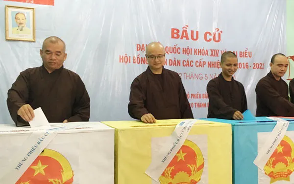 Thầy Thích Nhật Thiện, Trưởng Ban Trị sự GHPGVN Quận 10 ( bìa trái) và chư tăng chùa Giác Ngộ bỏ phiếu bầu cử. Ảnh: Quý Ngọc