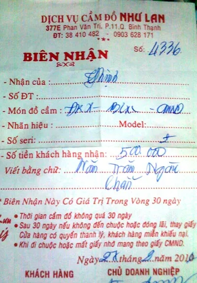 Chúng tôi đặt chiếc điện thoại nokia E66 lên bàn. Chủ tiệm cầm chiếc điện thoại lên ngắm nghía, xoay tới xoay lui, mở cả nắp và pin phía sau ra kiểm tra rồi nói ngắn gọn: “Một triệu năm trăm ngàn. Lãi suất bốn mươi ngàn đồng một tuần, được thì ghi hóa đơn”.