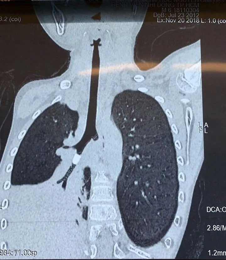 Sau khi thăm khám, các bác sĩ đã nhận thấy rõ hội chứng xâm nhập và tắc nghẽn tại phổi phải, hình ảnh chụp X-quang ngực tức thì không cho thấy rõ có dị vật lạ. Tuy nhiên, sau khi hội chẩn, TS.BS Trịnh Hồng Nhiên, trưởng khoa Hô Hấp Bệnh viện Nhi Đồng Thành Phố cho rằng, có vùng bẫy không khí trong phim chụp x-quang phổi, kết hợp với phim CT scan ngực thấy có sự hiện diện của một vật thể lạ trong phế quản, dạng hình trụ, bít lòng hoàn toàn nhánh phế quản S9 dẫn tới việc không khí không thể đi qua hoàn toàn vật thể, gây tắc và xẹp toàn bộ nửa phổi phải.