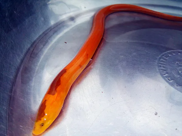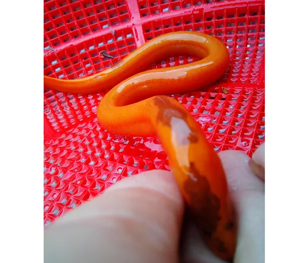 Con lươn vàng dài 35cm, nặng 0,1kg được ông Tân bắt được vào đêm 1-12