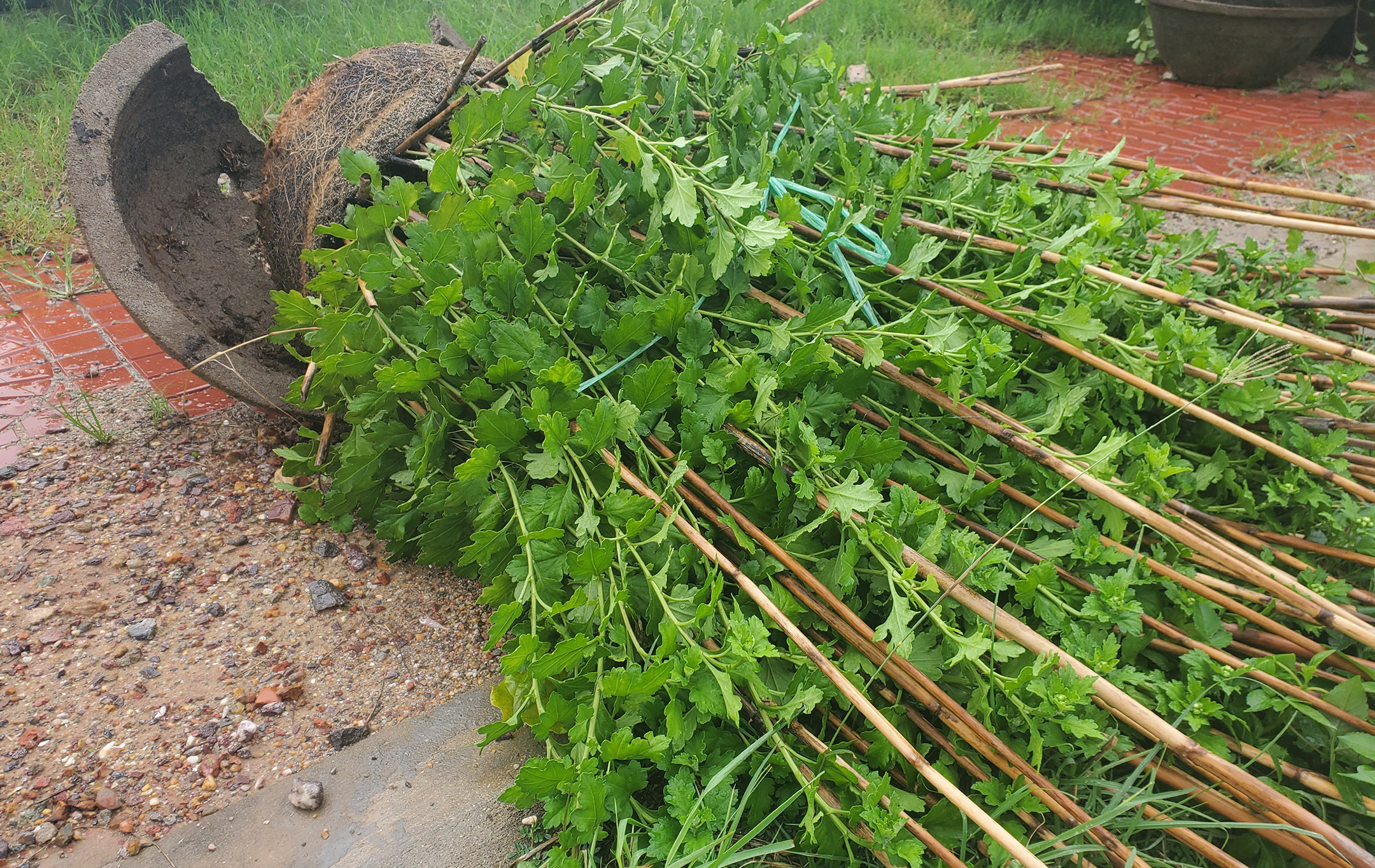 | Các chậu hoa cúc tết tại làng cúc Đống Đa bị gió quật đổ nằm la liệt |