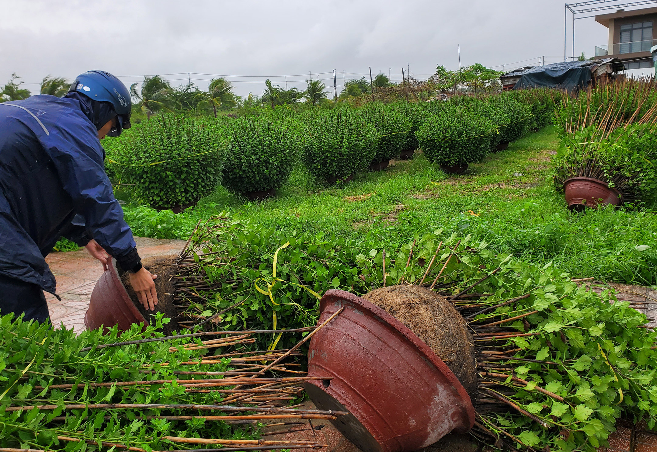 | Gió lớn càn quét, quật ngã hàng ngàn chậu hoa cúc tết của người dân ở phường 9, TP Tuy Hòa |