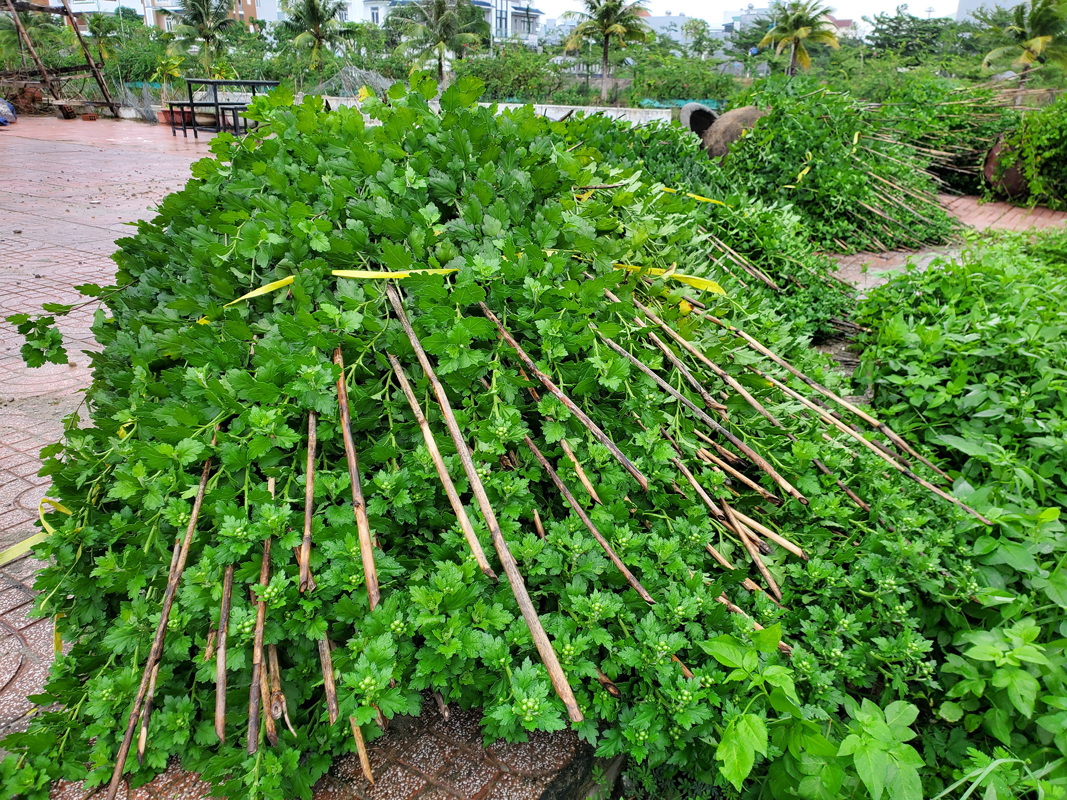 | Tại vườn nhà ông H.V.P (phường 9, TP Tuy Hòa), 700 chậu hoa cúc tết cao hơn 1m bị ngã đổ nằm sát đất, nhiều cây hoa bị gãy đọt, dập nụ. |
