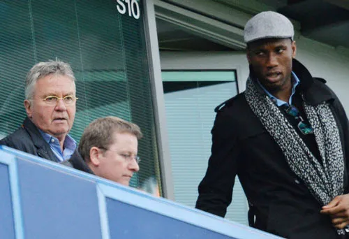 HLV Guus Hiddink (trái) và tiền đạo Drogba trên khán đài sân Stamford Bridge