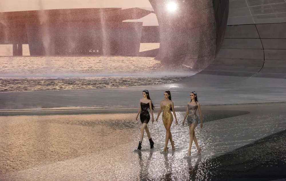 Hoa hậu Tiểu Vy, Hoa hậu Trân Đài, Hoa hậu Bảo Ngọc cũng là những người đẹp được lựa chọn trình diễn ở các vị trí quan trọng trong show. Giữa không gian ráng chiều ấn tượng, sàn diễn trên nước độc đáo đi cùng dòng thác phía sau lưng người mẫu đã tạo thành cảnh tượng hoành tráng, khó quên.
