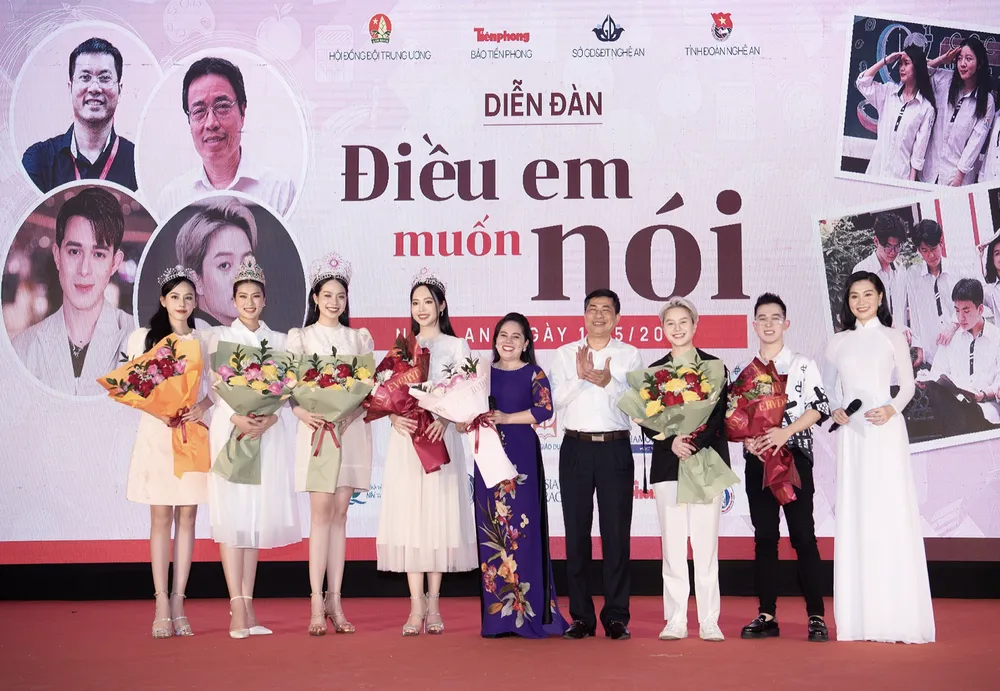 Top 3 Hoa hậu Việt Nam 2022 Huỳnh Thị Thanh Thủy, Trịnh Thùy Linh, Lê Nguyễn Ngọc Hằng cùng Hoa hậu Hòa bình Việt Nam - Miss Grand Vietnam 2022 Đoàn Thiên Ân vừa tham dự chương trình giao lưu cùng hàng ngàn học sinh tại THPT Huỳnh Thúc Kháng (TP Vinh, Nghệ An).