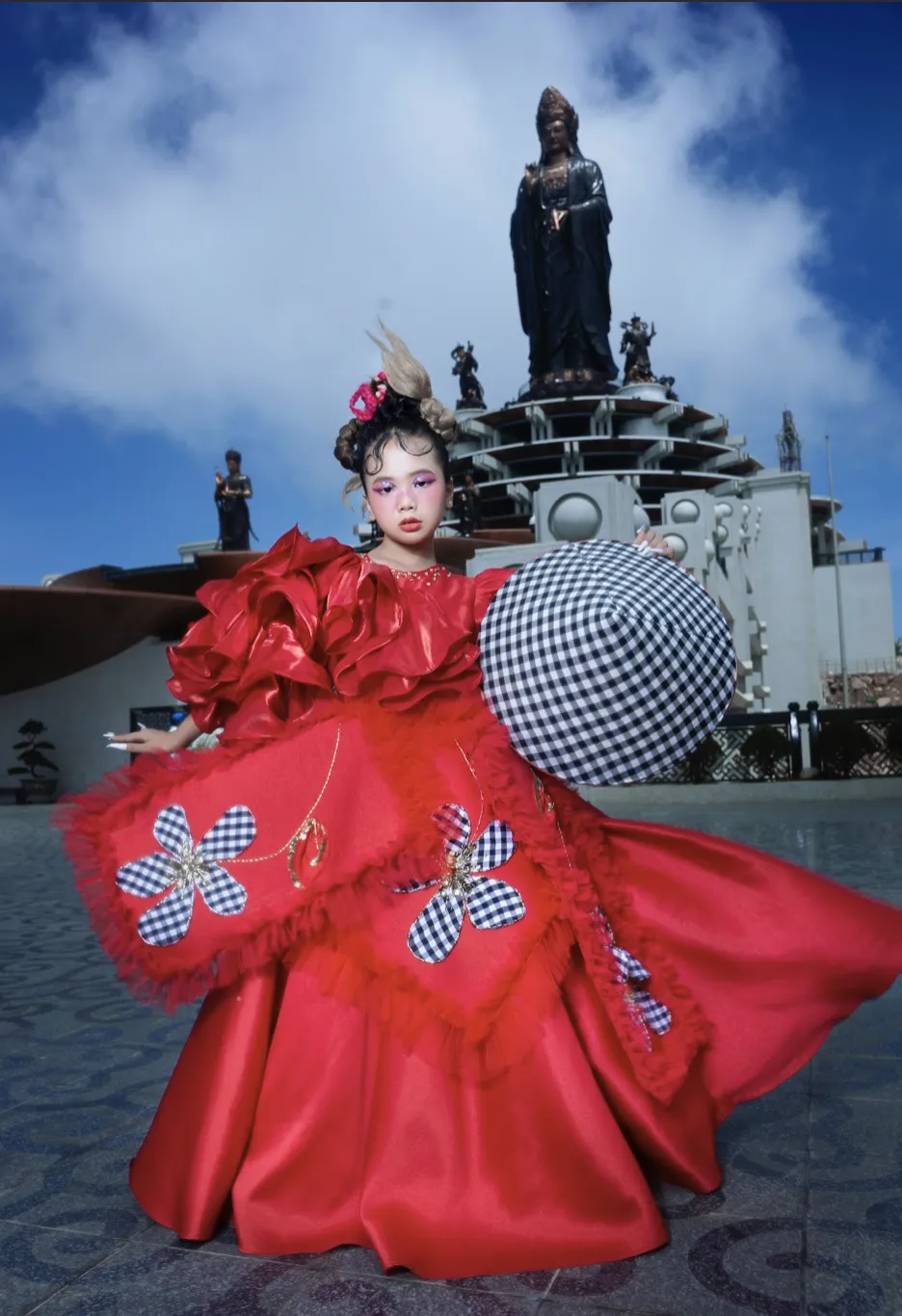 Mẫu nhí Kiều Hân ấn tượng với chiếc váy dài 20m lấy cảm hứng từ khăn rằn. Ảnh: HIẾU VÕ |
