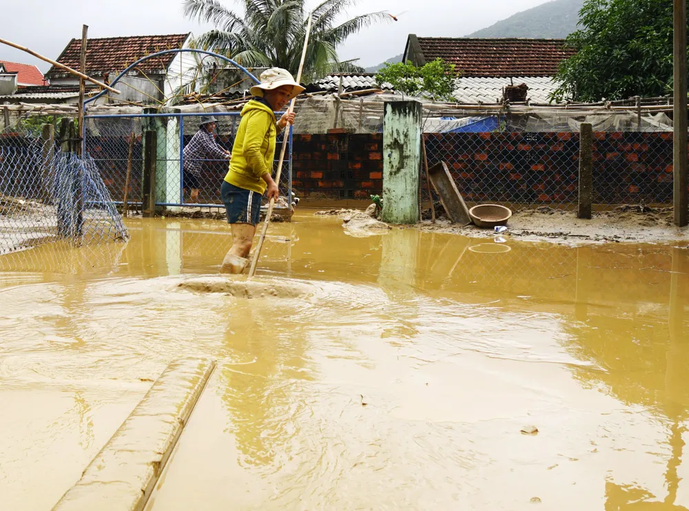 Ngày 17-11, người dân thôn Chánh Thắng trở về nhà dọn dẹp bùn đất