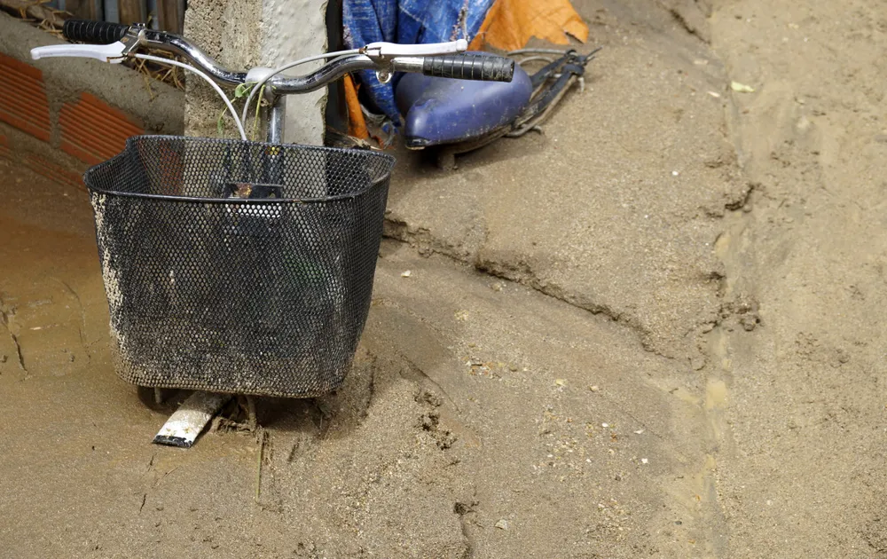 Bùn đất vùi lấp chiếc xe đạp của người dân thôn Chánh Thắng
