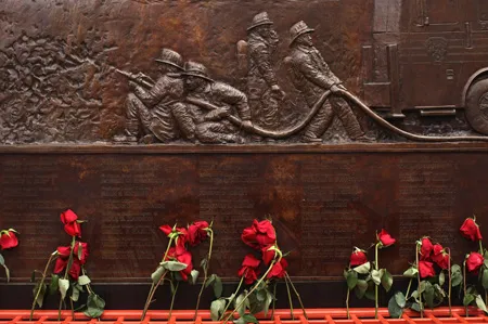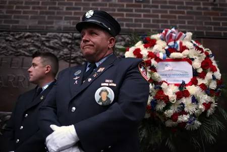 Nhân viên cứu hỏa mang banner có số 343, số nhân viên cứu hỏa đã hy sinh trong vụ tấn công khủng bố ngày 11-9-2001 tại Trung tâm thương mại thế giới, trong buổi lễ tưởng niệm tại Nhà thờ chánh tòa St. Patrick ở New York