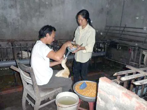 Thao tác nhồi ngan lấy gan béo của ông Thuấn