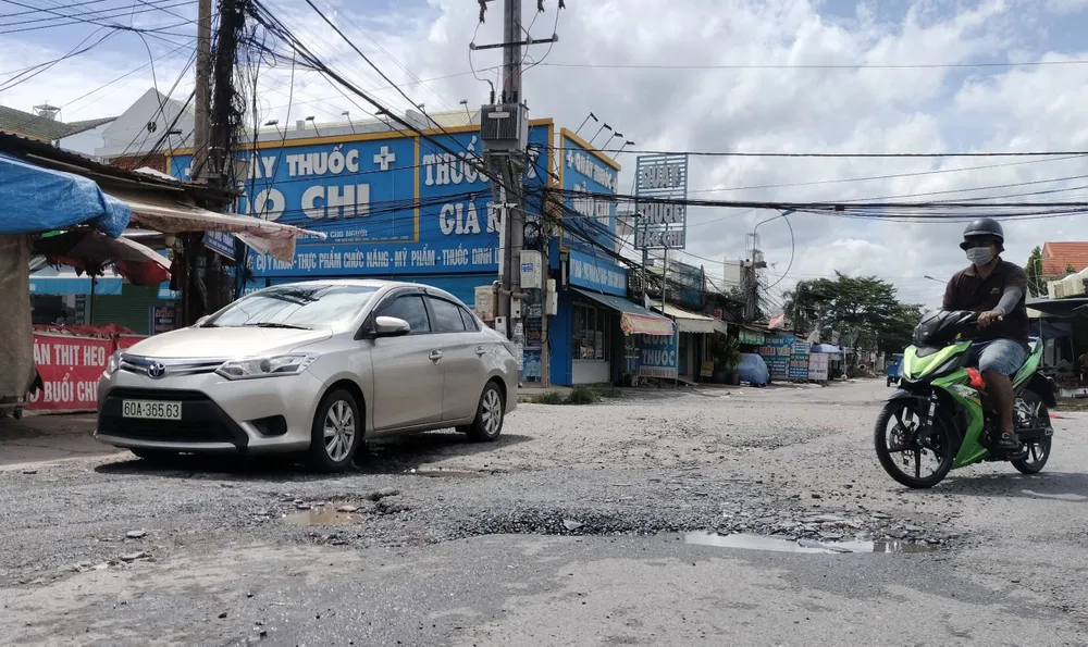 Tại khu vực ngã tư đường Tôn Đức Thắng và đường Võ Thị Sáu (thị trấn Long Thành, huyện Long Thành, tỉnh Đồng Nai), mặt đường xuống cấp nghiêm trọng, xuất hiện rất nhiều ổ gà, gây nguy hiểm cho người đi đường (ảnh).