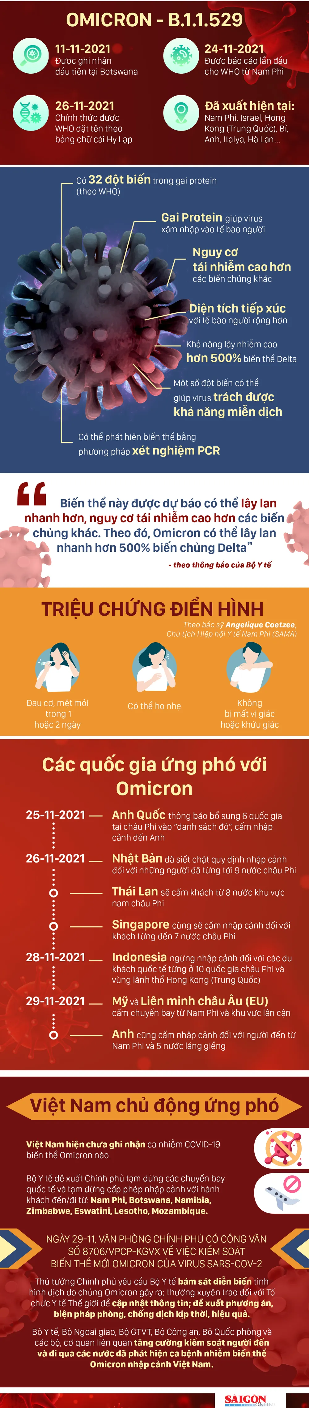Biến thể Omicron được WHO xếp vào nhóm biến thể đáng lo ngại, đã ghi nhận tại nhiều quốc gia, vùng lãnh thổ. Nhiều nước gấp rút áp lệnh hạn chế đi lại để ứng phó với biến thể mới này.
