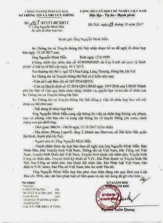 Công văn của Sở Thông tin và Truyền thông Hà Nội đồng ý cho ông Mẫn được tổ chức họp báo