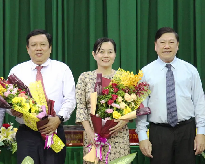 Ông Trần Văn Rón, Bí thư Tỉnh ủy Vĩnh Long trao hoa chúc mừng cho tân Phó Chủ tịch UBND tỉnh Vĩnh Long (bìa trái)
