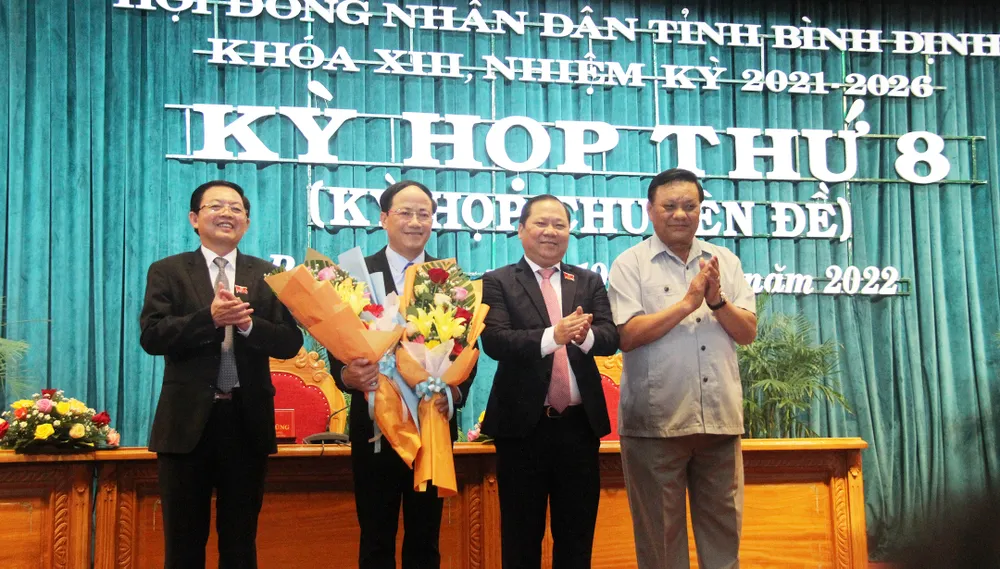 Lãnh đạo tỉnh Bình Định tặng hoa cho ông Nguyễn Phi Long hoàn thành nhiệm vụ ở Bình Định