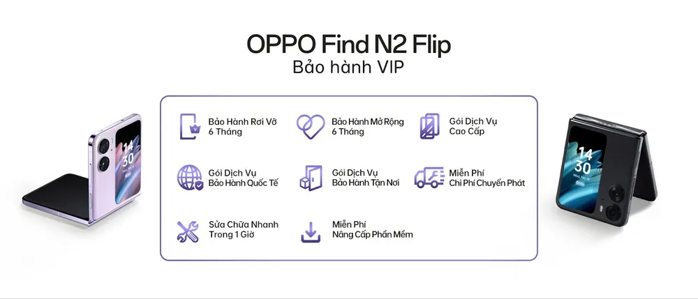 Khi sử dụng smartphone màn hình gập, ngoài độ bền màn hình, dịch vụ bảo hành cũng là một mối quan tâm lớn đối với người dùng. Hiểu được nhu cầu đó, bên cạnh các chính sách bảo hành cơ bản, OPPO còn đặc biệt cung cấp Gói Bảo hành V.I.P dành riêng cho Find N2 Flip, trong đó kể đến: Bảo hành rơi vỡ màn hình trong 6 tháng khi màn hình bị hư hỏng do vô tình làm rơi vỡ, va chạm; Bảo hành mở rộng 6 tháng kéo dài thời hạn bảo hành sau khi sản phẩm hết hạn bảo hành mặc định (12 tháng); Gói dịch vụ cao cấp trong suốt vòng đời sản phẩm, người dùng được sử dụng miễn phí các dịch vụ bao gồm Vệ sinh chuyên sâu, Dán chống loá màn hình chính và Dán chống UV màn hình phụ (2 lần/năm; Bảo hành quốc tế tại các trung tâm bảo hành uỷ quyền của OPPO tại bất kỳ quốc gia/ khu vực nào mà sản phẩm được phân phối.