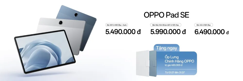 OPPO Pad SE chính thức lên kệ với ba phiên bản, các sản phẩm có giá chính thức: OPPO Pad SE (Bản Wifi ram 4GB + dung lượng 128GB màu bạc, xanh giá 5.490.000 đồng; OPPO Pad SE bản màn hình nhám Wifi, ram 4GB + dung lượng 128GB màu bạc giá 5.990.000 đồng và OPPO PAD SE ram 4GB + dung lượng 128GB màu bạc giá 6.490.000 đồng.