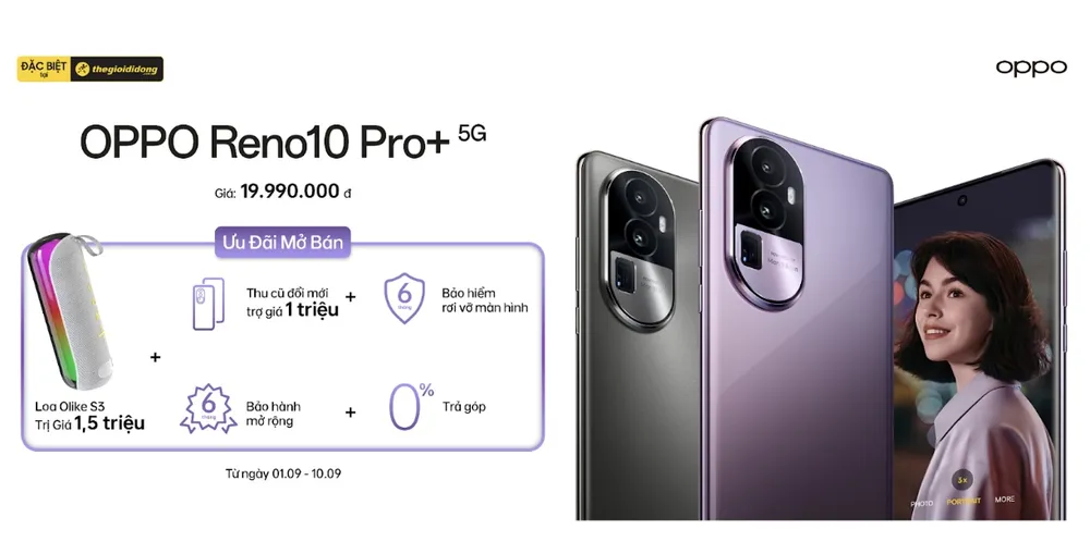 Reno10 Pro+ 5G sẽ chính thức được mở hôm nay tại hệ thống Thế Giới Di Động trên toàn quốc từ với giá 19.990.000 đồng. Đặc biệt, từ nay đến 10-9, khách hàng mua máy sẽ nhận được những ưu đãi giá trị, bao gồm: Loa bluetooth Olike S3 trị giá 1.500.000 đồng, hỗ trợ thu cũ đổi mới trợ giá 1 triệu đồng, 6 tháng bảo hành mở rộng, 6 tháng bảo hiểm rơi vỡ màn hình... và trả góp 0%.
