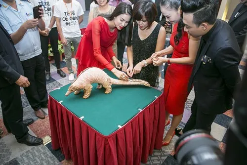 Diện bộ đầm đỏ thanh lịch, Phạm Hương trông thật xinh đẹp với nụ cười tươi tắn luôn nở trên môi. Cô có nhiều thời gian trò chuyện cùng ca sĩ Thu Minh, một trong những nghệ sĩ Việt tiên phong cho các dự án bảo vệ động vật hoang dã, cùng với việc hội ngộ Trấn Thành - cũng là đại sứ tham gia chương trình này.