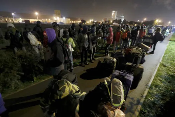 Từ sáng nay, hàng trăm người di cư mang đồ đạc bắt đầu xếp hàng ngoài một nhà chứa máy bay ở Calais để được tái định cư khi chính quyền Pháp bắt đầu dọn trại tạm cư còn gọi là "rừng" này, chứa 6.500 người di cư, chuyển tới 450 trung tâm khắp Pháp.
