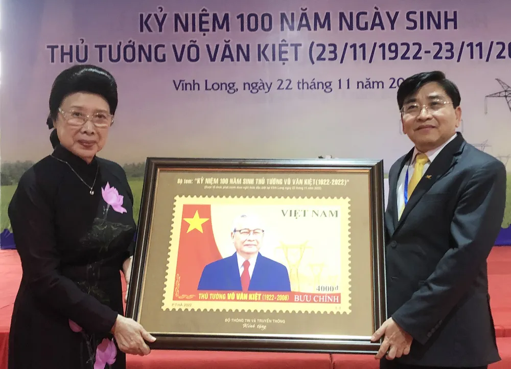 Đoàn lãnh đạo, nguyên lãnh đạo Đảng và Nhà nước dành phút mặc niệm tưởng nhớ đồng chí Võ Văn KiệtGóc phải của mẫu tem là hình ảnh đường dây tải điện 500KV Bắc - Nam (mạch 1) - dấu ấn đậm nét trong sự nghiệp của Thủ tướng Võ Văn Kiệt, thể hiện tầm nhìn chiến lược, góp phần đảm bảo an ninh năng lượng, phát triển kinh tế, chính trị, xã hội và an ninh quốc phòng của đất nước.