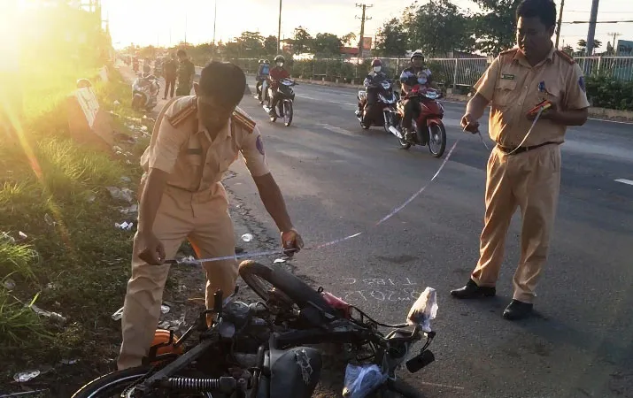 Tại hiện trường, lực lượng chức năng phát hiện bên lề đường có vết cày dài, cách đó khoảng 5m là chiếc xe máy BKS: 61G1 - 056.35 cùng nón bảo hiểm, áo và nón bảo hộ lao động.
