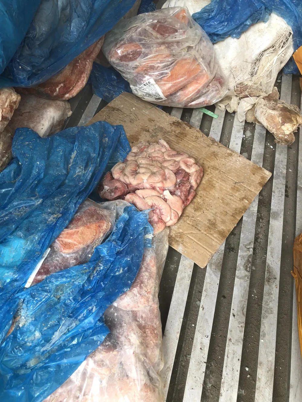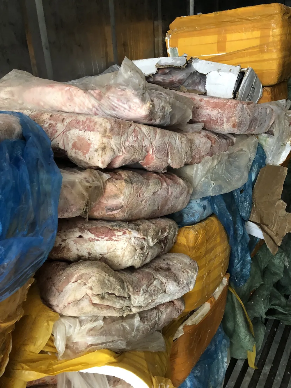 Qua kiểm tra, công an phát hiện bên trong có chứa nhiều sản phẩm nội tạng (vú heo, ức vịt, dồi trường heo), thịt bò không có nhãn hiệu chứng minh nguồn gốc, xuất xứ và không ghi thời hạn sử dụng. Công an đã lập biên bản tạm giữ lô hàng khoảng 10 tấn sản phẩm nội tạng và thịt bò nêu trên.