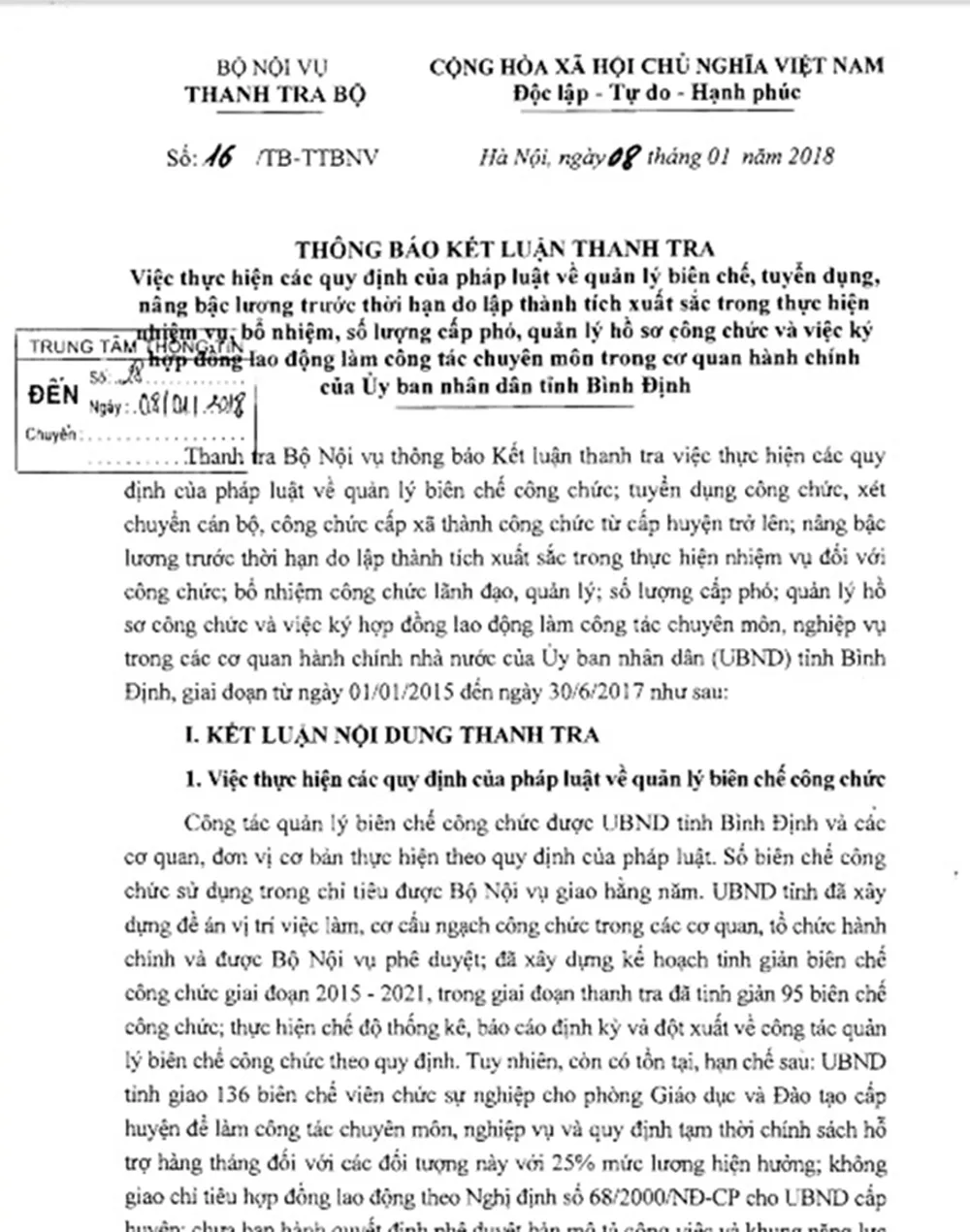 Ngày 9-1, Thanh tra Bộ Nội vụ vừa ban hành văn bản số 16 TB-TTBNV, thông báo kết luận thanh tra việc thực hiện các quy định của pháp luật về quản lý biên chế, tuyển dụng, nâng bậc lương trước thời hạn do lập thành tích xuất sắc trong thực hiện nhiệm vụ, bổ nhiệm, số lượng cấp phó, quản lý hồ sơ công chức và việc ký hợp đồng lao động làm công tác chuyên môn trong cơ quan hành chính của UBND tỉnh Bình Định
