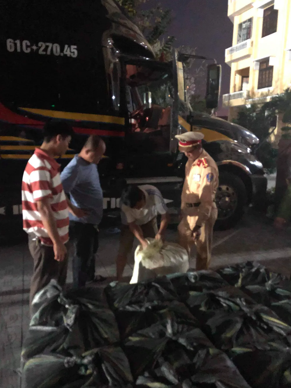 Khoảng 2 giờ sáng 23-12, Đội Cảnh sát điều tra tội phạm về kinh tế và chức vụ - Công an TP Huế phối hợp với Đội tuần tra kiểm soát số 2 thuộc Phòng CSGT Công an tỉnh Thừa Thiên – Huế phát hiện và bắt giữ xe đầu kéo BKS 61C- 270.45 kéo theo rơ móc 61R – 023.44 đang vận chuyển thuốc lá nhập lậu.