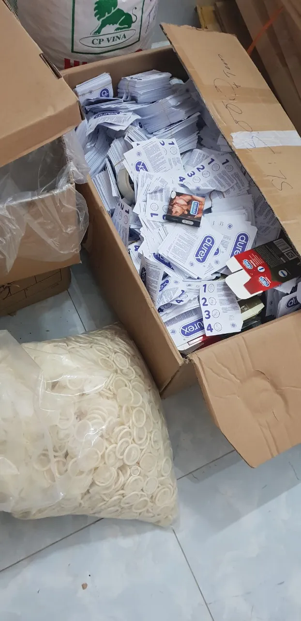 Tại thời điểm kiểm tra, lực lượng chức năng phát hiện hơn 163.000 sản phẩm (thành phẩm và bán thành phẩm) bao cao su các loại mang thương hiệu Durex, Inova, Sure, Ok xuất xứ Malaysia, Thái Lan; trên 118.000 vỏ bao bì các loại, tem nhãn tiếng Việt ghi sản xuất tại Indonesia, Malaysia; 60kg dung dịch lỏng cùng 1 phễu chiết rót bằng tay…