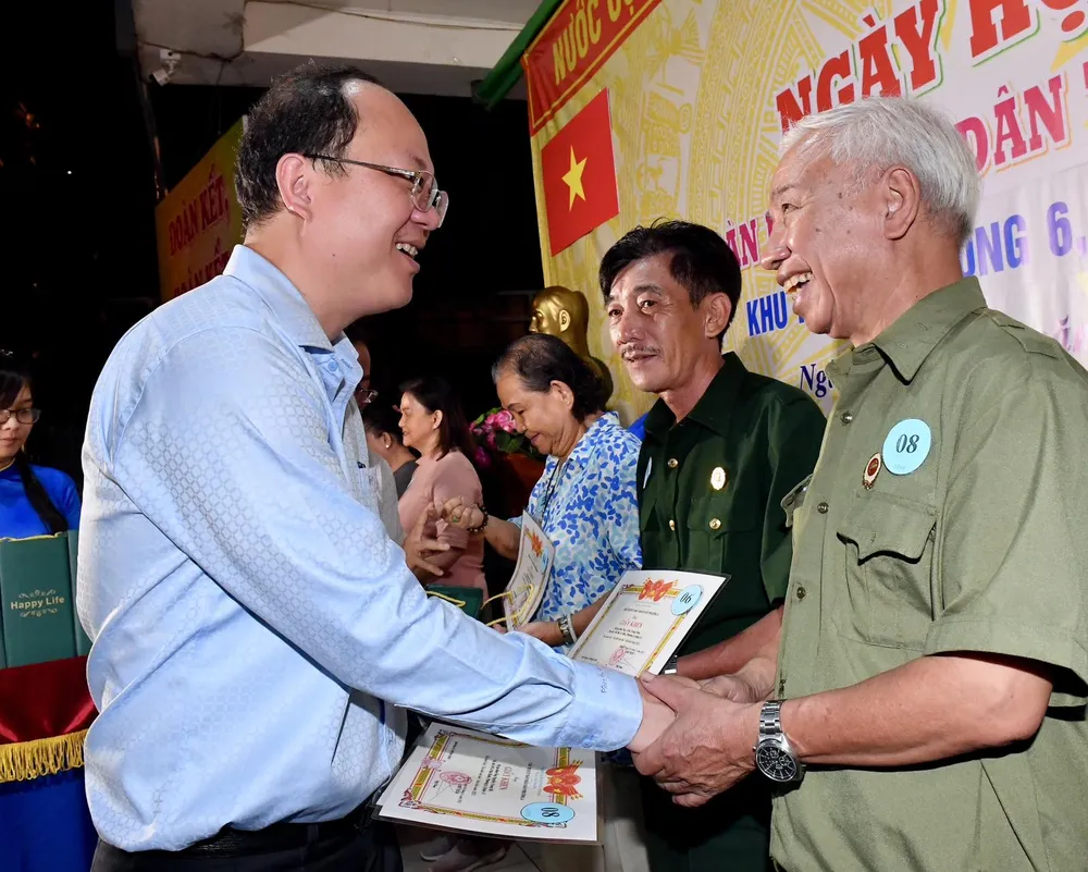 Phó Bí thư Thành ủy TPHCM Nguyễn Hồ Hải trao khen thưởng các hộ gia đình văn hóa tiêu biểu, các gương "Người tốt, việc tốt" năm 2023. Ảnh: VIỆT DŨNG |