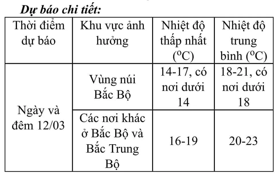 Từ chiều 12-3, vùng núi phía Bắc của Bắc bộ trời chuyển rét. Từ đêm 12 đến 13-3, ở Bắc bộ và Bắc Trung bộ trời rét. Ngày 13-3, khu vực từ Quảng Bình đến Thừa Thiên - Huế trời chuyển rét.