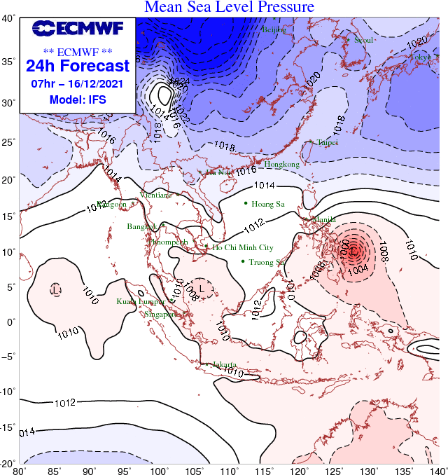Dự báo trong 24 giờ tới, bão này di chuyển theo hướng Tây Tây Bắc, mỗi giờ đi được 20-25km. Đến 16 giờ ngày 16-12, tâm bão trên vùng biển phía Đông Nam miền Trung Philippines. Sức gió mạnh nhất vùng gần tâm bão mạnh cấp 13 (130-150km/giờ), giật cấp 16.