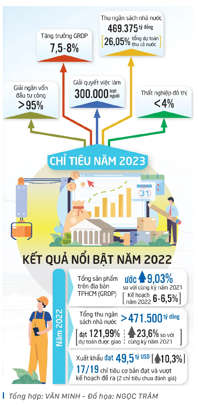 Trong bối cảnh đó, TPHCM xác định chủ đề năm 2023: “Nâng cao hiệu quả hoạt động công vụ, đẩy mạnh cải cách hành chính và cải thiện môi trường đầu tư; phát triển kinh tế gắn với bảo đảm an sinh xã hội”. Những nhiệm vụ trọng tâm về kinh tế - xã hội đã được thảo luận và thống nhất tại 3 Hội nghị Thành ủy, HĐND và UBND TPHCM vừa qua, tập trung giải pháp đẩy mạnh thực hiện các dự án hạ tầng quan trọng; tăng cường giải ngân đầu tư công; tiếp tục hỗ trợ, đồng hành với cộng đồng doanh nghiệp, tháo gỡ vướng mắc khó khăn; thúc đẩy các nguồn lực của xã hội, doanh nghiệp tham gia đầu tư phát triển; tập trung đảm bảo an sinh xã hội, nhất là lao động, việc làm, nhà ở xã hội; chương trình giảm nghèo bền vững; nghiên cứu, ban hành chính sách củng cố lại hệ thống an sinh, bảo trợ xã hội. Cùng với đó, hỗ trợ người nghèo, lao động nhập cư, lao động trong khu vực phi chính thức có sinh kế bền vững hơn.
