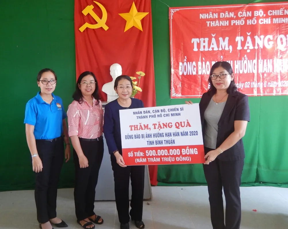 Tại Nhà Văn hóa thôn Dân Hiệp, xã Thuận Hòa, huyện Hàm Thuận Bắc (tỉnh Bình Thuận), đoàn công tác đã trao 500 triệu đồng cho Ủy ban MTTQ Việt Nam tỉnh Bình Thuận. Đây là món quà tình cảm của nhân dân, cán bộ và chiến sĩ TPHCM hỗ trợ tỉnh Bình Thuận chăm lo đời sống cho đồng bào địa phương đang chịu thiệt hại nặng nề do hạn hán gây ra.