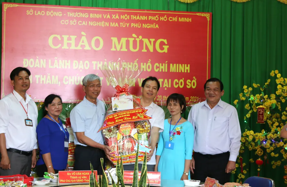 Phó Chủ tịch UBND TPHCM Võ Văn Hoan (bìa phải) và Giám đốc Sở LĐTB-XH TPHCM Lê Minh Tấn tặng quà tết các cơ sở cai nghiện ma túy đặt trên địa bàn tỉnh Bình Phước