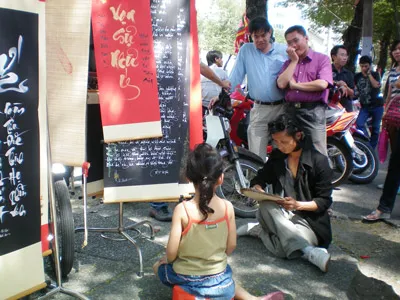 Dãy phố tranh thư pháp trước cổng Cung Văn hóa Lao động (đường Nguyễn Thị Minh Khai, quận 1, TPHCM) trưng bày hàng ngàn bức tranh đón chào xuân mới. Tại đây những tác phẩm được thể hiện trên nhiều chất liệu như: giấy, đá, tre, lụa…
