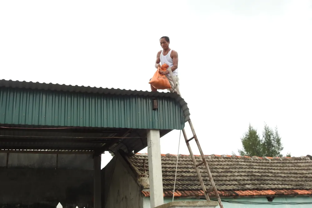 Người dân xã Quảng Hưng, Quảng Trạch che chắn lại mái nhà. Ảnh: Minh Phong