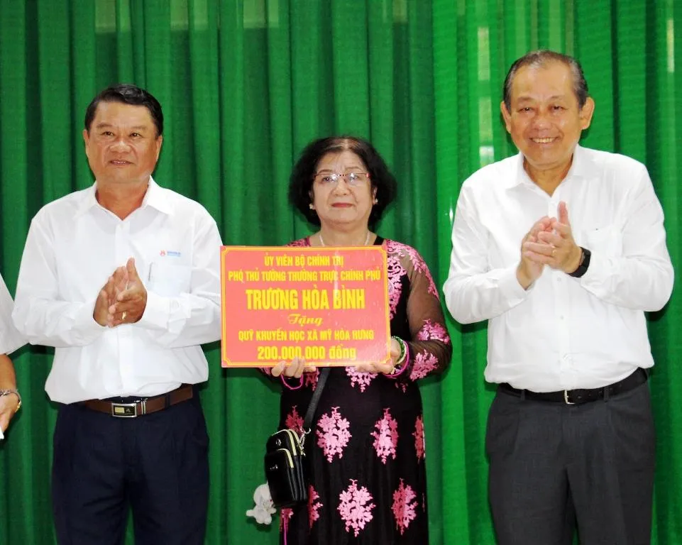 Phó Thủ tướng cho biết, để tạo điều kiện tiếp sức cho các cháu đến trường, vì sự nghiệp trồng người cao cả, tạo nguồn nhân lực cho địa phương. Quỹ bảo trợ học sinh dân tộc thiểu số, học sinh nghèo của Báo CAND đã vận động một số tổ chức, cá nhân, đóng góp, hỗ trợ 200 triệu đồng trao tặng xã Mỹ Hòa Hưng, phục vụ công tác khuyến học, khuyến tài, chăm lo cho học sinh nghèo vượt khó, hiếu học địa phương.
