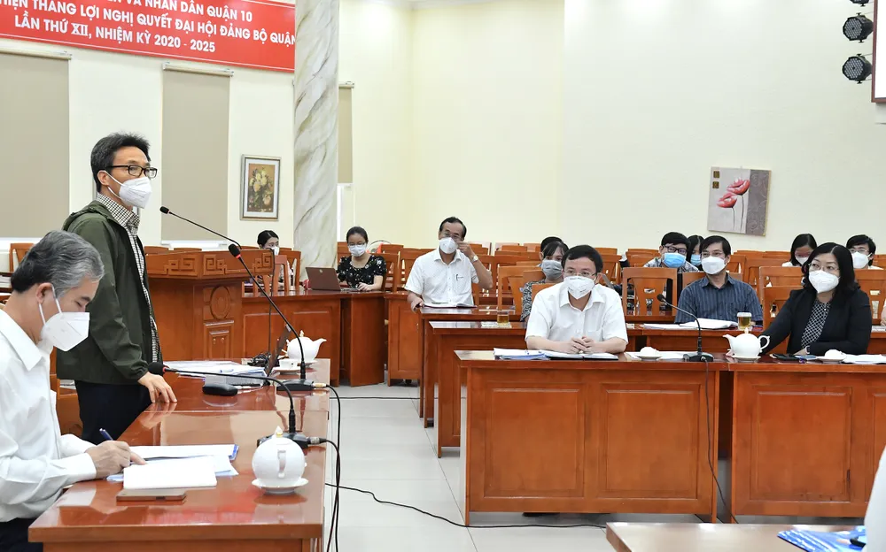 Trước tình hình chưa tách F0 ra khỏi cộng đồng và nguy cơ lây nhiễm trong khu cách ly, phong tỏa, Phó Thủ tướng Vũ Đức Đam lưu ý, quận 10 phải làm kỹ lưỡng, quản lý nghiêm ngặt, tránh tình trạng bên ngoài giăng dây nghiêm, bên trong vẫn đi lại, giao lưu.