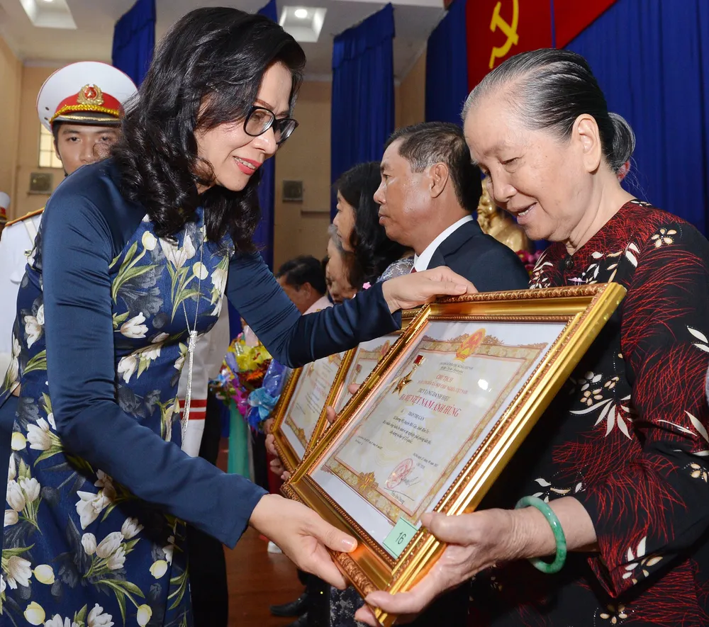 Phó Chủ tịch UBND TPHCM Nguyễn Thị Thu trao tặng danh hiệu Bà mẹ Việt Nam anh hùng cho thân nhân các mẹ. Ảnh: VIỆT DŨNG