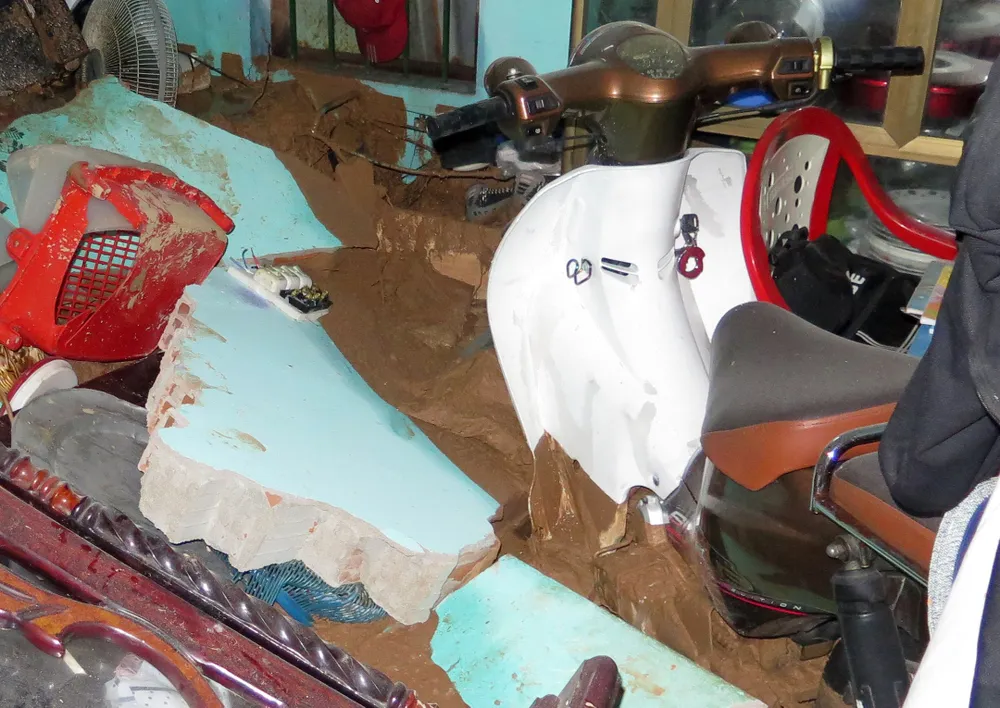 Tại hiện trường, đất đá vùi lấp gần như toàn bộ ngôi nhà ông Tấn. Tất cả các đồ đạc, tài sản đều bị vùi lấp trong bùn đất, đá.