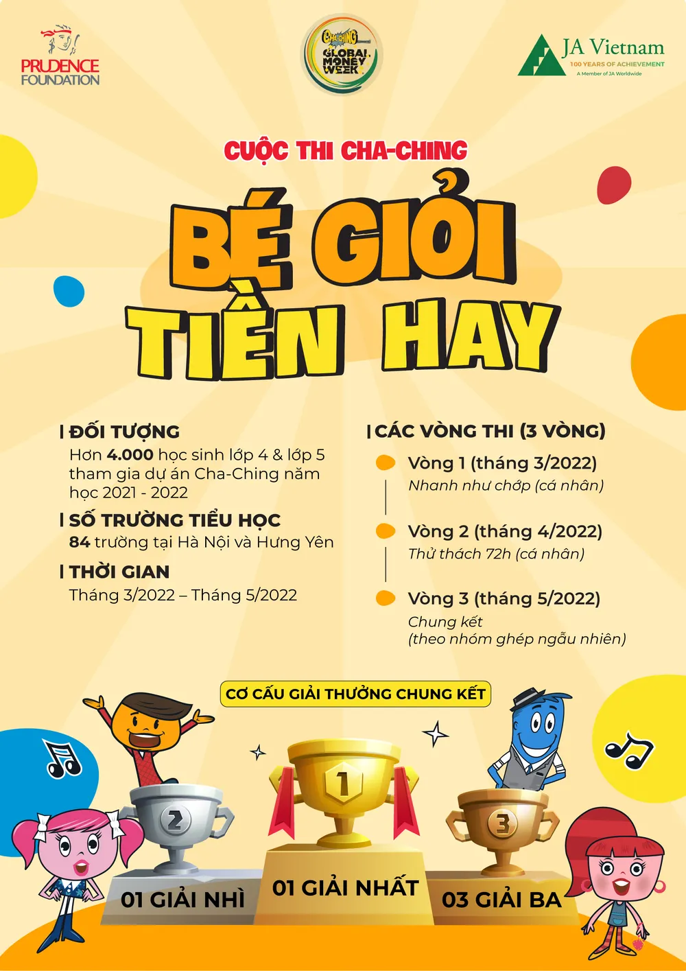 Hưởng ứng Chiến dịch tài chính toàn cầu Global Money Week diễn ra từ ngày 21-3 đến 27-3-2022, công ty TNHH Bảo hiểm Nhân thọ Prudential Việt Nam (Prudential) và tổ chức Junior Achievement Vietnam (JA Việt Nam) khởi động cuộc thi Cha-Ching “Bé giỏi Tiền hay”, nằm trong khuôn khổ dự án Cha-Ching với sự tham gia của hơn 4.000 học sinh đã học chương trình giáo dục tài chính Cha-Ching tại Hà Nội và Hưng Yên trong năm học 2021-2022. Cuộc thi Cha-Ching “Bé giỏi Tiền hay” có ba vòng thi kéo dài từ tháng 3-2022 đến tháng 5-2022.