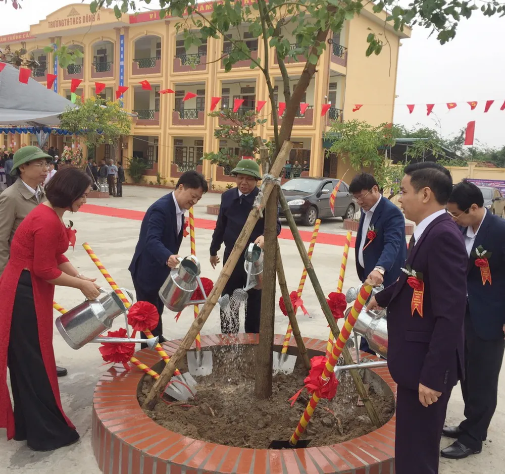 Nghi thức cắt băng khánh thành công trình Trường THCS Đông ÁÔng Hoàng Văn Quang, Phó Tổng giám đốc PV GAS đã cùng các đại biểu thực hiện nghi thức cắt băng khánh thành trường, gắn biển tài trợ và trồng cây lưu niệm trong khuôn viên nhà trường.