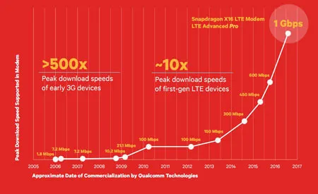 Trong các phần trình diễn, Qualcomm Technologies sẽ minh họa các tốc độ Gigabit Class LTE với modem Snapdragon X16 LTE ra mắt gần đây. Gigabit Class LTE đánh dấu một cột mốc quan trọng trong ngành công nghiệp di động, đem đến tốc độ download nhanh hơn đến 10 lần so với các thiết bị LTE thế hệ đầu và gấp 500 lần so với các thiết bị 3G trước đây. Hợp tác với Ericsson và Ericssion Networks Software 16B, phần trình diễn sẽ cho thấy cách để đạt tốc độ download lên đến 1 Gbps b sử dụng kết hợp sóng mang 3x, 4x4 MIMO trên hai sóng mang, và điều biến cao hơn dùng 256-QAM.