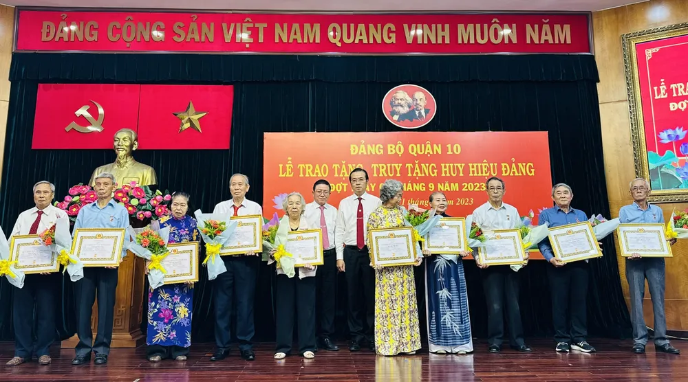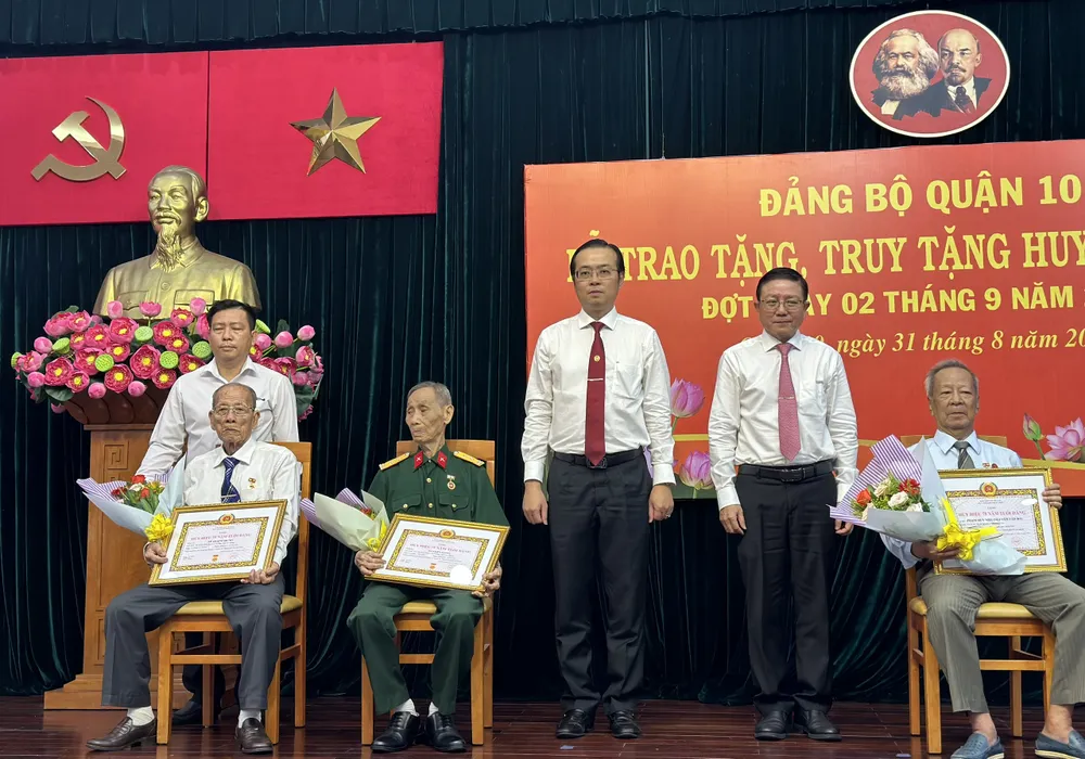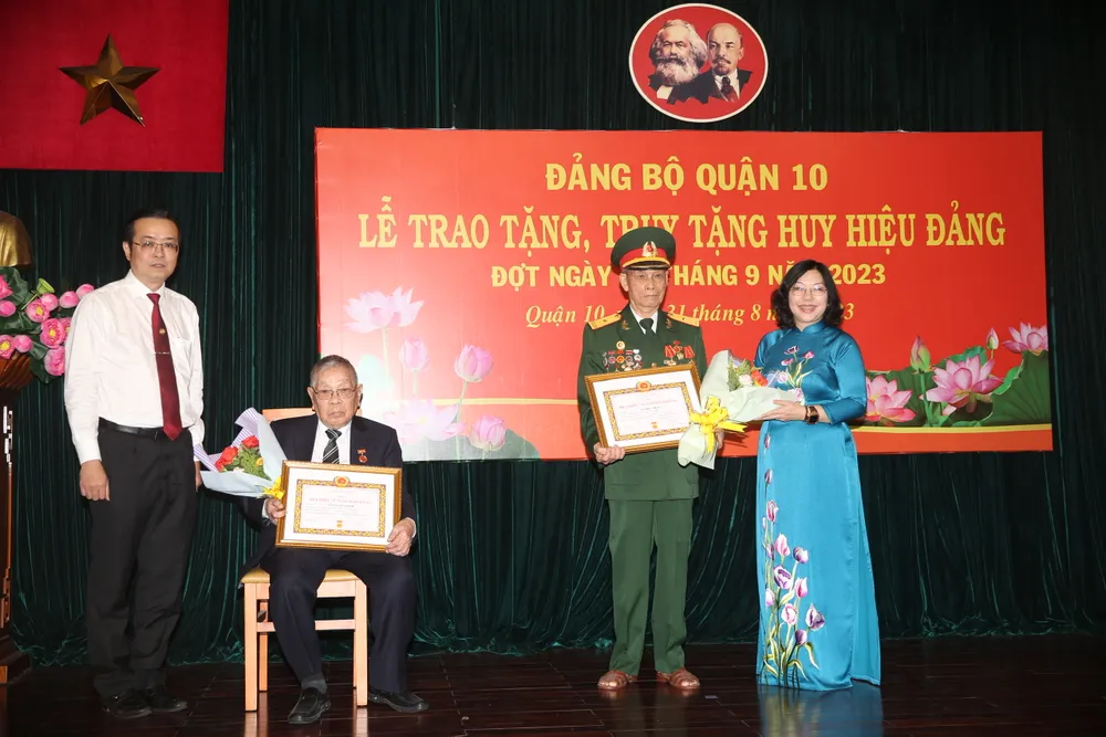 Cùng ngày, Quận ủy quận 10 (TPHCM) đã tổ chức lễ trao tặng, truy tặng Huy hiệu Đảng cho đảng viên cao tuổi Đảng đợt 2-9.