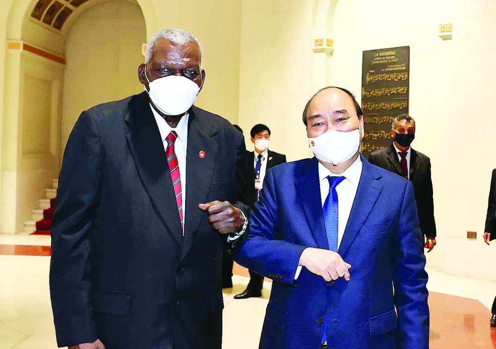 Hai nhà lãnh đạo vui mừng nhận thấy mối quan hệ mẫu mực Việt Nam-Cuba không ngừng được củng cố và phát triển toàn diện trong bối cảnh tình hình quốc tế biến động khó lường và dịch bệnh Covid-19 diễn biến phức tạp. Hai bên đã vượt qua nhiều thách thức, duy trì các cuộc đối thoại cấp cao và các cơ chế hợp tác bằng hình thức trực tuyến; kịp thời hỗ trợ lẫn nhau đối phó với dịch bệnh Covid-19, thể hiện tình cảm gắn bó đặc biệt, đoàn kết anh em và tương trợ lẫn nhau.