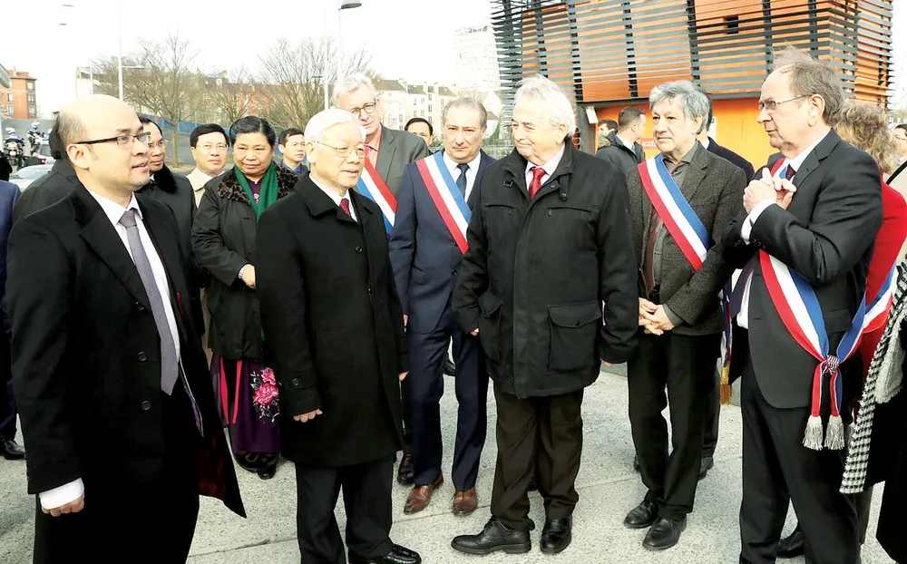 Tổng Bí thư Nguyễn Phú Trọng gặp gỡ một số bạn bè Pháp của Việt Nam tại Tòa thị chính Choisy Le Roi nhân kỷ niệm 45 năm ký Hiệp định Paris về Việt Nam