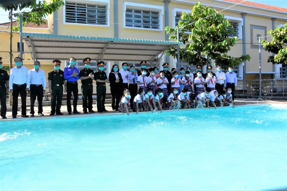 Em Võ Thanh Trung, học sinh lớp 5/3 Trường Tiểu học Bình Hoà Nam vui mừng tâm sự: “Ngày thường con chỉ đi tắm kênh, nay có hồ bơi ngay trong trường nên con thích lắm”.